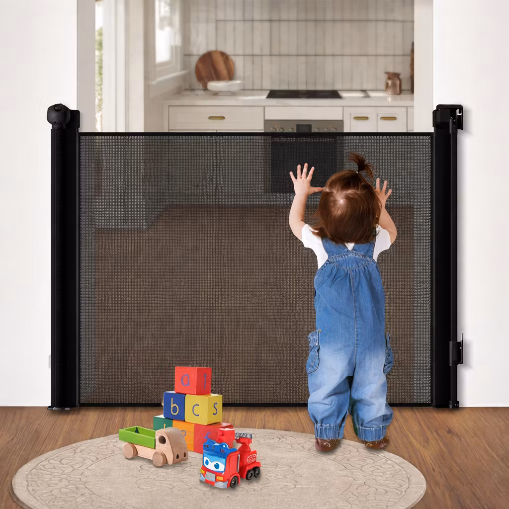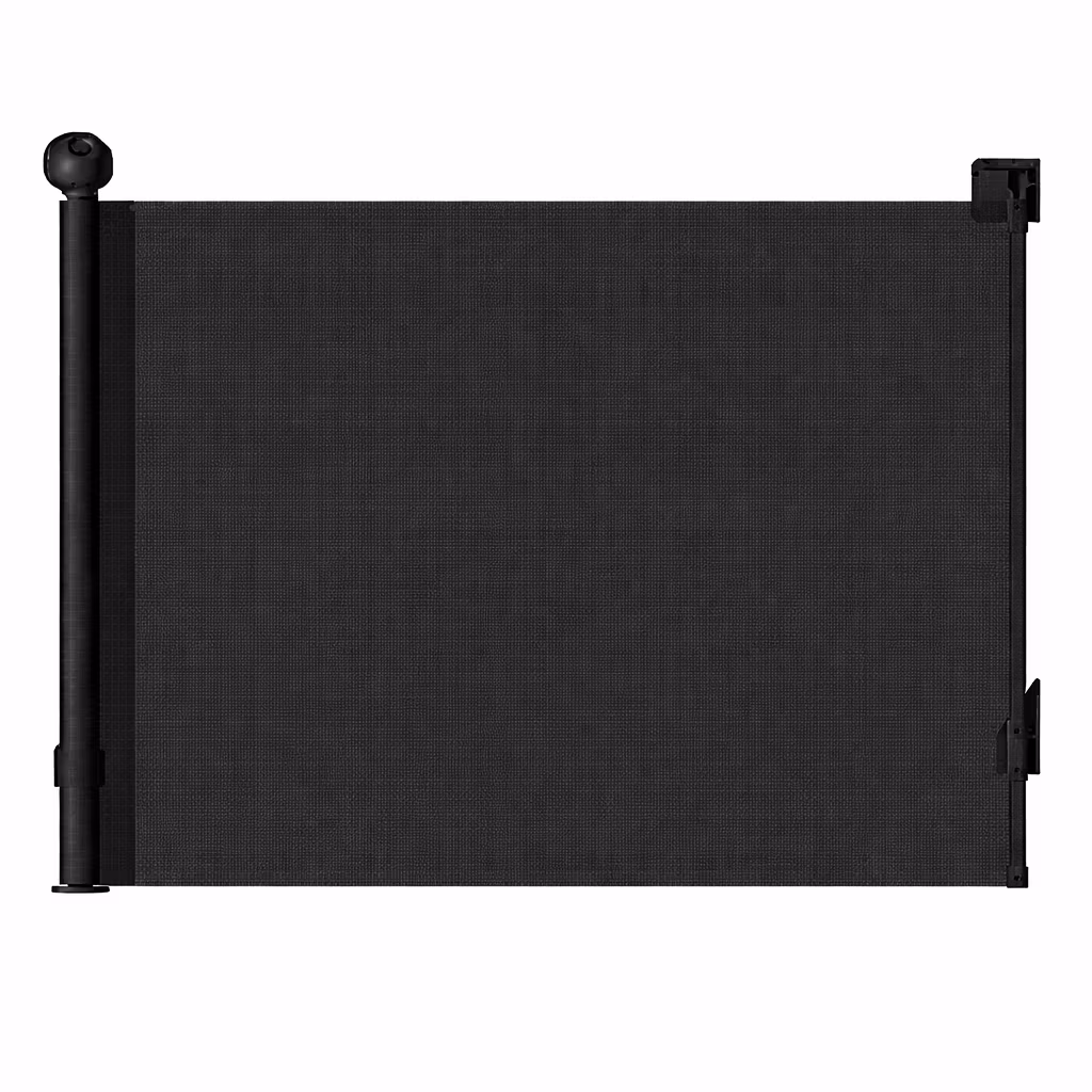 Med sin rullgardinskonstruktion i slitstark väv och en stabil ram i aluminium passar grinden perfekt i moderna hem där funktion och form går hand i hand.